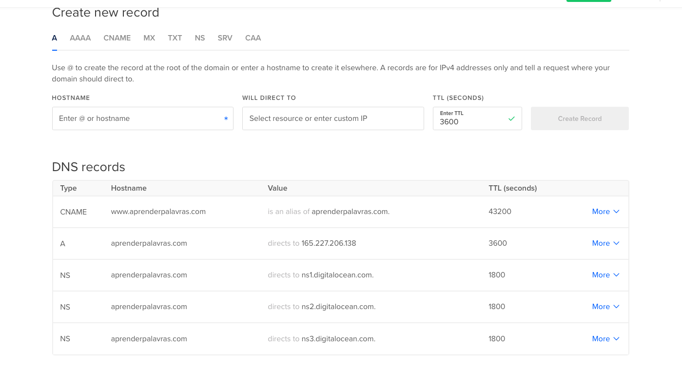 Then you need to go to the Digital Ocean domain manager and create an A record for your droplet's IP. Then a CNAME record to redirect WWW to your domain.