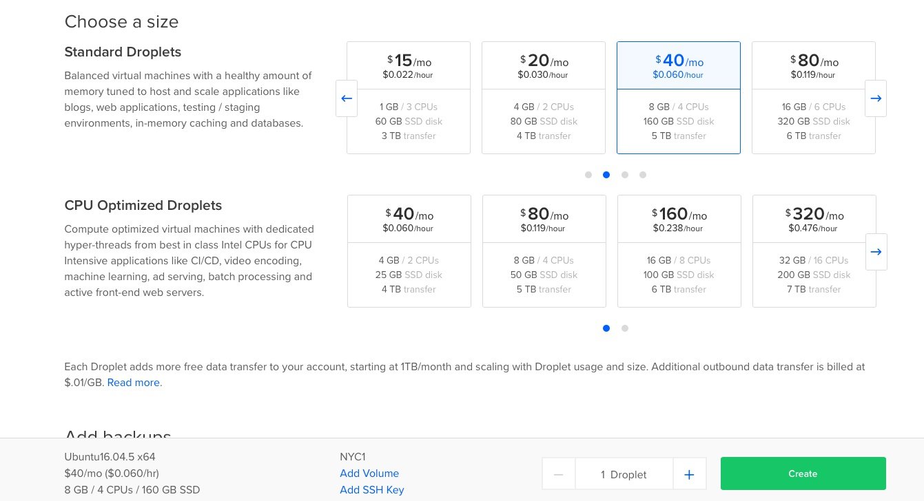 With Digital Ocean you can have servers with 1 up to 32 processing cores or up to 64GB of ram. Not only that, in DO (affectionate nickname) you can also choose the location of your server, add a backup option, add storage, choose between IPv6 and other options when configuring your server.