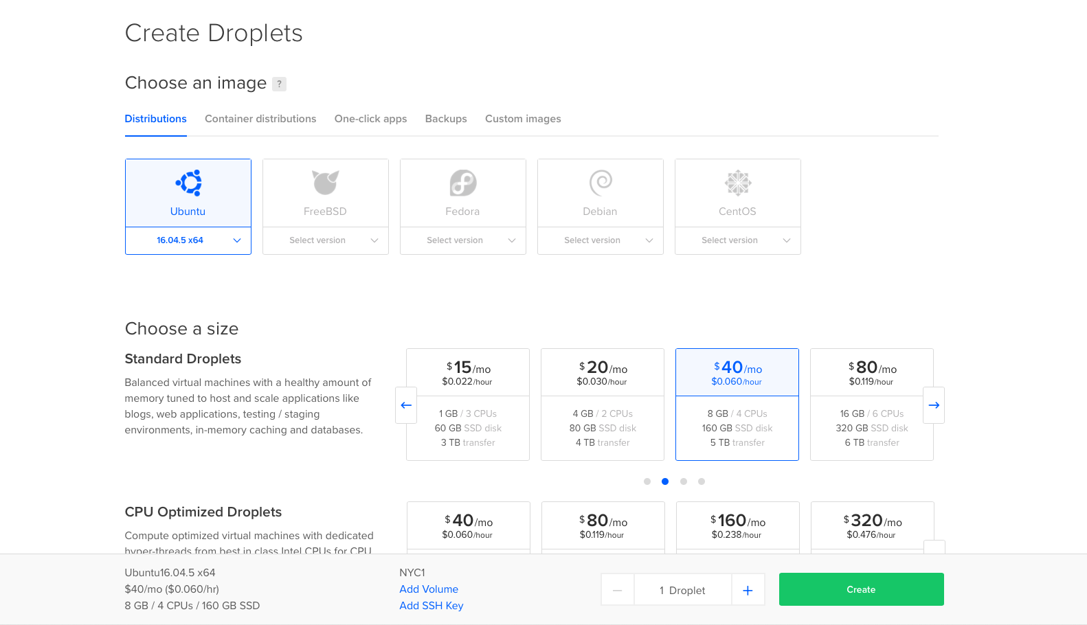 The first thing you need to do is create an account using my referral link. After registering, confirming, and logging into your Digital Ocean account, you will create a server by clicking the create button (Create > Droplet). The droplets are your servers with IP, SSH access, and the operating system of your choice.